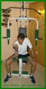 Sentado, con una mancuerna cogida en supinación y el codo apoyado en la cara interna del muslo, inspirar y efectuar una flexión del codo, espirar al final del esfuerzo.
