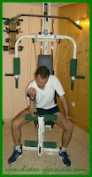 De pie, de cara al aparato, el mango cogido en supinación, inspirar y efectuar una flexión de los codos, espirar al final del movimiento.