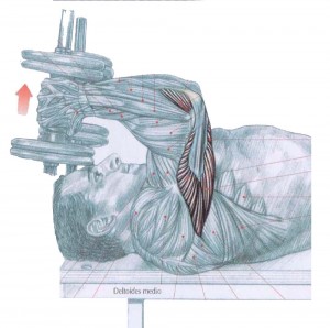 De pie, piernas ligeramente flexionadas, tronco inclinado hacia delante manteniendo la espalda recta. Brazo en horizontal, paralelo al cuerpo, codo flexionado, inspirar y efectuar una extensión del codo. Espirar al final del movimiento.