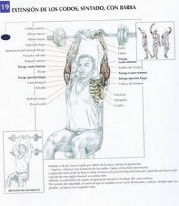 Sentado o de pie, barra cogida por detrás de la nuca, manos en pronación, inspirar y efectuar una extensión de los codos. Espirar al final del movimiento. La poisición vertical de los brazos estira con fuerza la porción larga del músculo y permmite una buena solicitación de esta región durante su contracción. Además, la extensión con agarre en pronación favorece el trabajo del vasto externo.