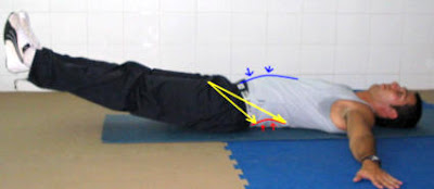 En la elevación de piernas extendidas desde decúbito supino, la musculatura abdominal se activa isométricamente para fijar la pelvis, y evitar un movimiento de anteversión que aumentaría la lordosis lumbar.