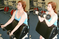 Para el curl de bíceps sostenga una pesa en cada mano, con las palmas hacia arriba. Poco a poco levántelas hasta llegar a la altura de sus hombros, luego baje lentamente. El martillo curl es el mismo ejercicio básico, pero usted tiene las manos con los pulgares arriba en lugar de tener las palmas hacia arriba. Para una mejor concentración debe sentarse, descansar el codo derecho contra el costado de la rodilla derecha, con la pesa en la mano manténgala paralela a su pecho y terminando en el hombro. Realice todas las repeticiones de un lado antes de pasar a la otra.